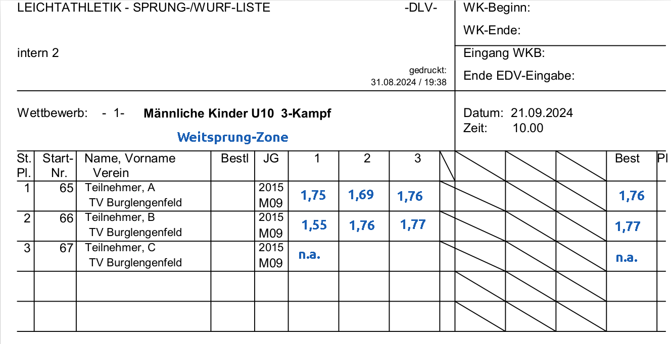 Wenn 3 Versuche erfasst sind, dann unter "Vbest" oder "Best" die beste Leistung und evtl. den